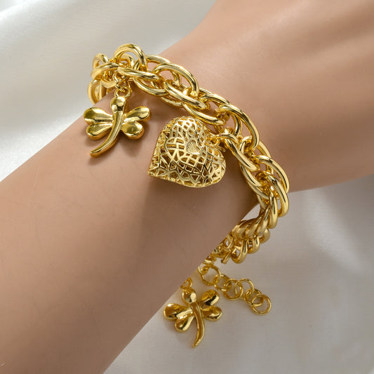 NEW Arrived Love hearts and dragonflies14k Gold Plated Link Chain Charm Bracelet
