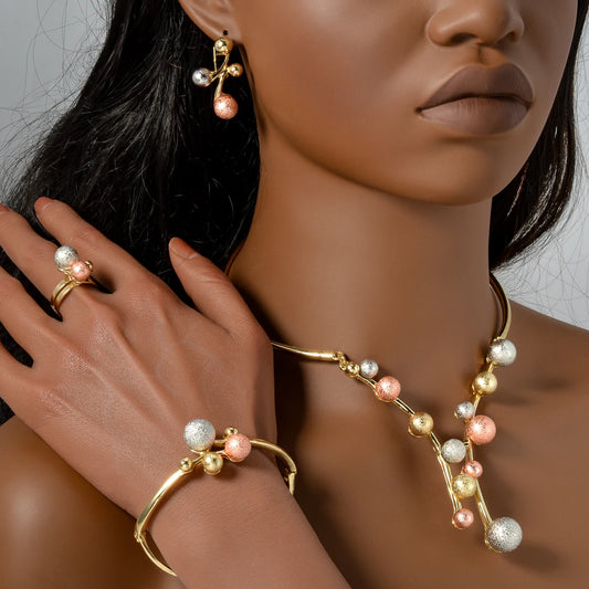 Luxury 4 Piece Womens Full 14K Gold Plated Pictures Ball Necklace And Earrings Jewelry set